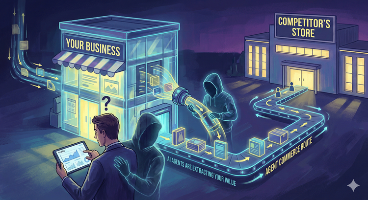 Here's what's happening: AI agents are visiting your site, extracting your content, answering user questions, and sending those users to your competitors. You never see these visits in your analytics. You never see the lost conversions. You just see the revenue gap.