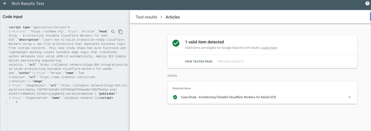 The Metadata-to-JSON Pipeline: The worker reads standard EDS metadata fields and automatically maps them to schema.org objects. This ensures search engines receive properly structured data without manual authoring errors or JSON syntax issues.