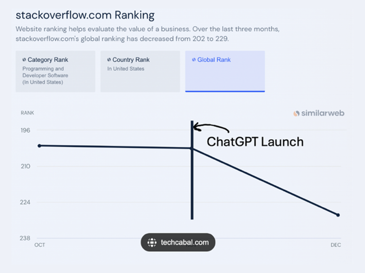 What happened to StackOverflow recently will begin to affect us all. The online Q&A platform for developers is releasing 28% of its staff to save costs, which is not necessarily related to AI. But look at the point where ChatGPT entered the picture: