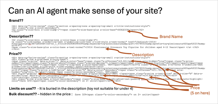Buried in the HTML are the brand name, the price (more than one is shown in the HTML), and the description. Note that discounts and age suitability are placed in the text. A human reading this would have difficulty, never mind an AI.