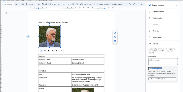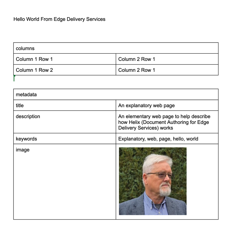 The image above shows our document with a table with two columns. The first row is merged and given the name ‘metadata’. This is the clue to Edge Delivery Services to use this information to adjust the metadata in the HTML.