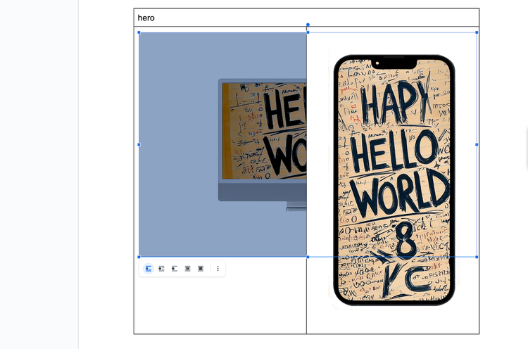 We begin by inserting a table in the document. The first cell is named Hero, and the image is in the second cell.