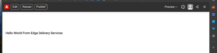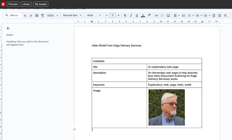The document above is named Hello World, and the text states, “Hello World From Edge Delivery Services.” Pressing the Preview button transfers the document as HTML to Edge Delivery Services’ content bus, which stores all the content for the eventual web pages. We also have a code bus and an asset bus.