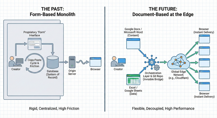 The power of this "invisible CMS" model lies in its underlying architecture. When a creator hits "save" in Microsoft SharePoint or Google Drive, the system doesn't just display a doc. This pattern is used by many systems, including Edge Delivery Services (EDS) and systems like Pantheon, which use WordPress as a delivery platform.