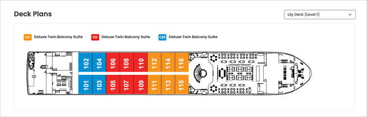 You're staying on Deck 1 (Lily Deck), which houses the main Lemongrass restaurant where all meals are served. All suites are identical in size with private balconies. Note: Cabin walls can be thin (occasional alarm sounds from neighboring cabins), and suitcases don't fit under beds - pack accordingly for limited storage space.